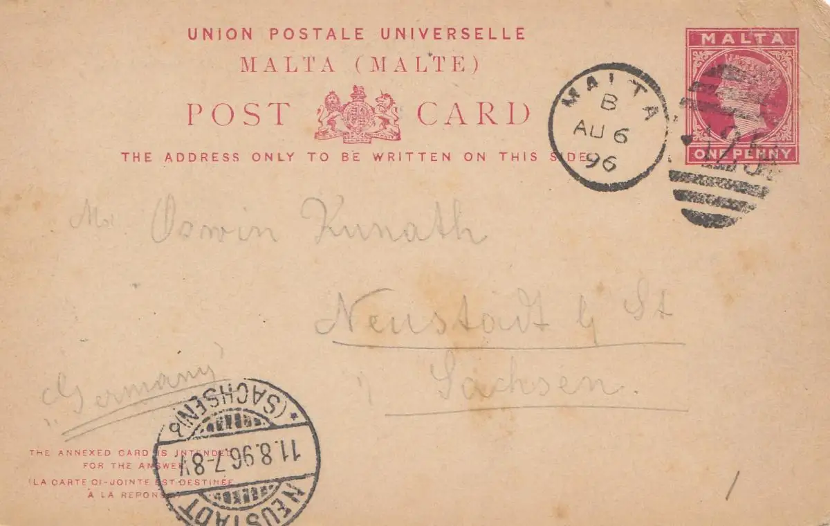 Malta: 1896: Post Card nach Neustadt/Sachsen