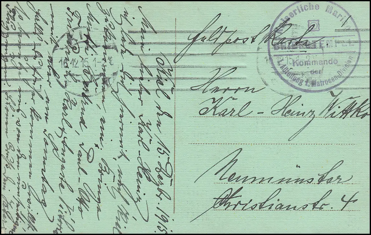 Marinefeldpost 1. Matrosen-Division, KIEL 16.12.1916 auf AK Luftkampf Taube
