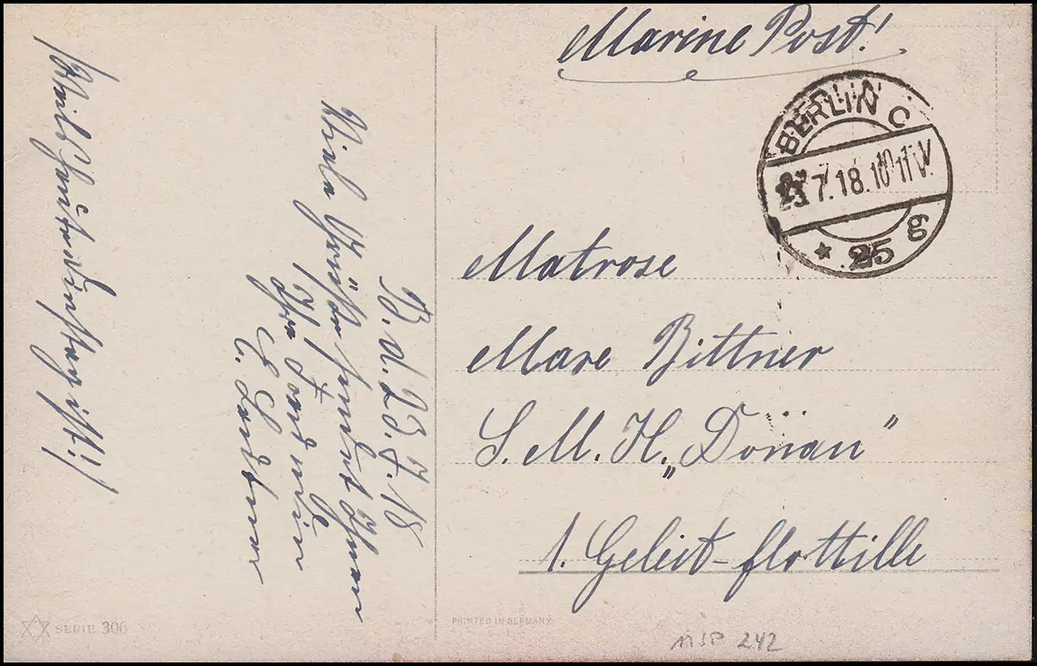 Marinefeldpost an einen Matrosen der SMH Donau Geleit-Flottille BERLIN 23.7.1918