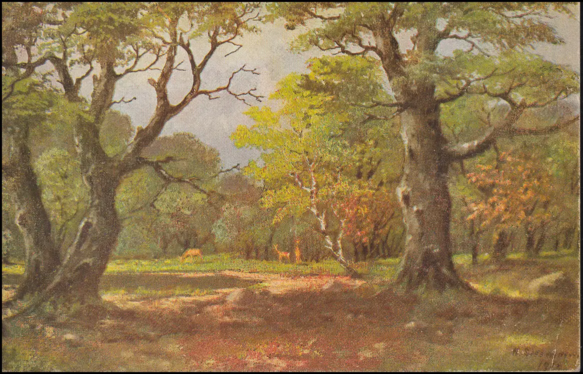 auf Gemälde-Ansichtskarte "Wald" mit Rehen"