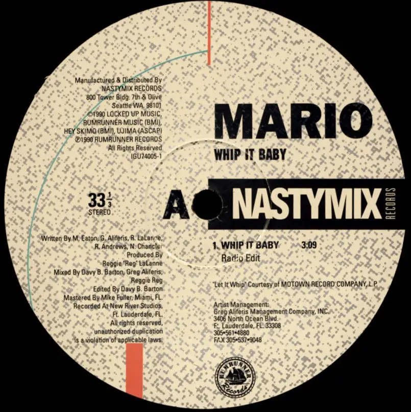 12" Maxi Mario - Whip It Baby, neutrales Cover mit Info-Aufkleber, Zustand Platte VG+ Hülle VG+; Made in United States 1990 Nastymix Records IGU 74005-1, Tracks Radio 3:09, Ext. Vers. 5:15