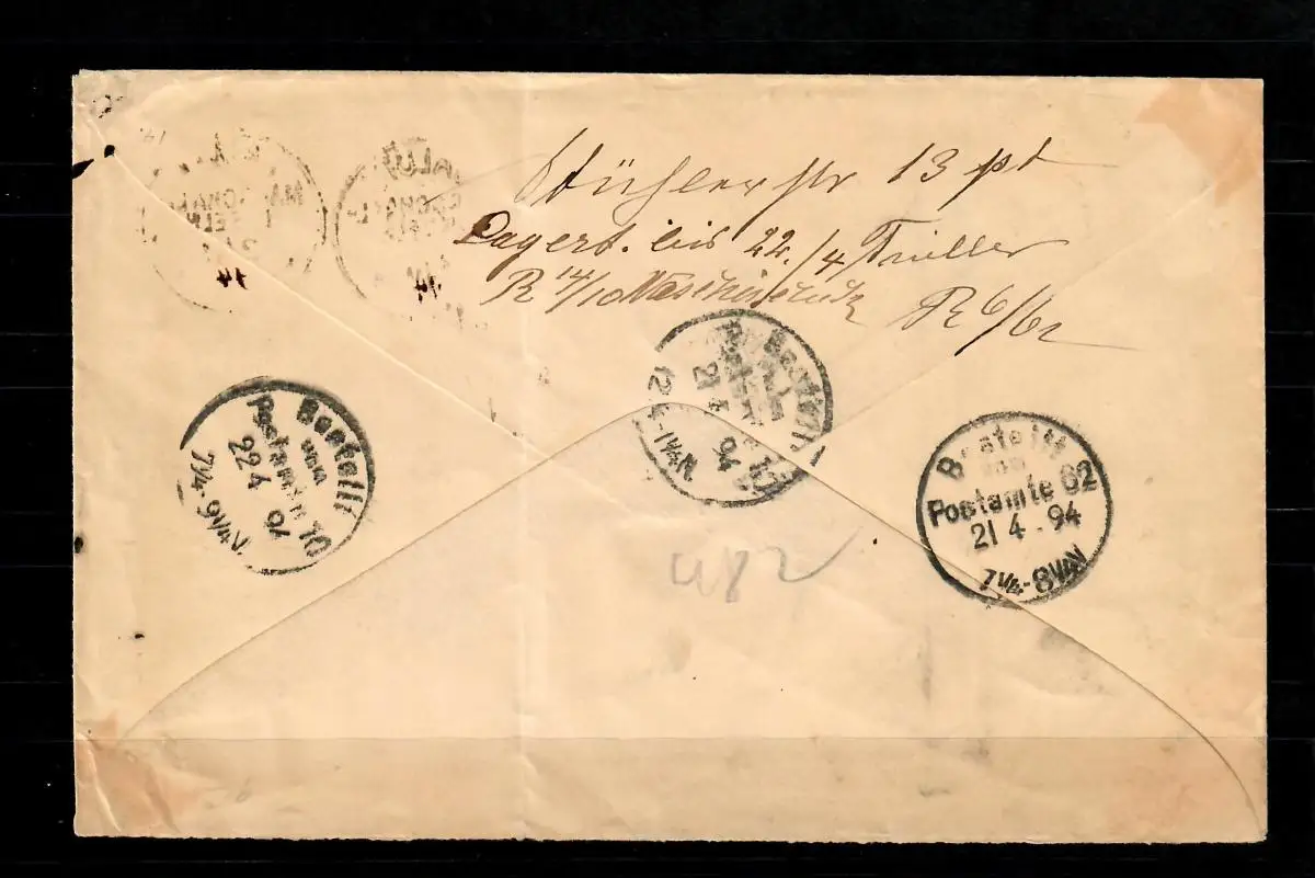1890/1900 20Pfg Krone/Adler als waagrechter Dreierstreifen auf doppelgewichtigem R-Brief mit Einschreibezettel Nr. 272, zweimal mit JALUIT 2/2 ohne Jahreszahl, 94 jeweils handschriftlich eingesetzt, an einen Direktor der Deutsch-Ostafrikanischen Gesellschaft in Berlin
