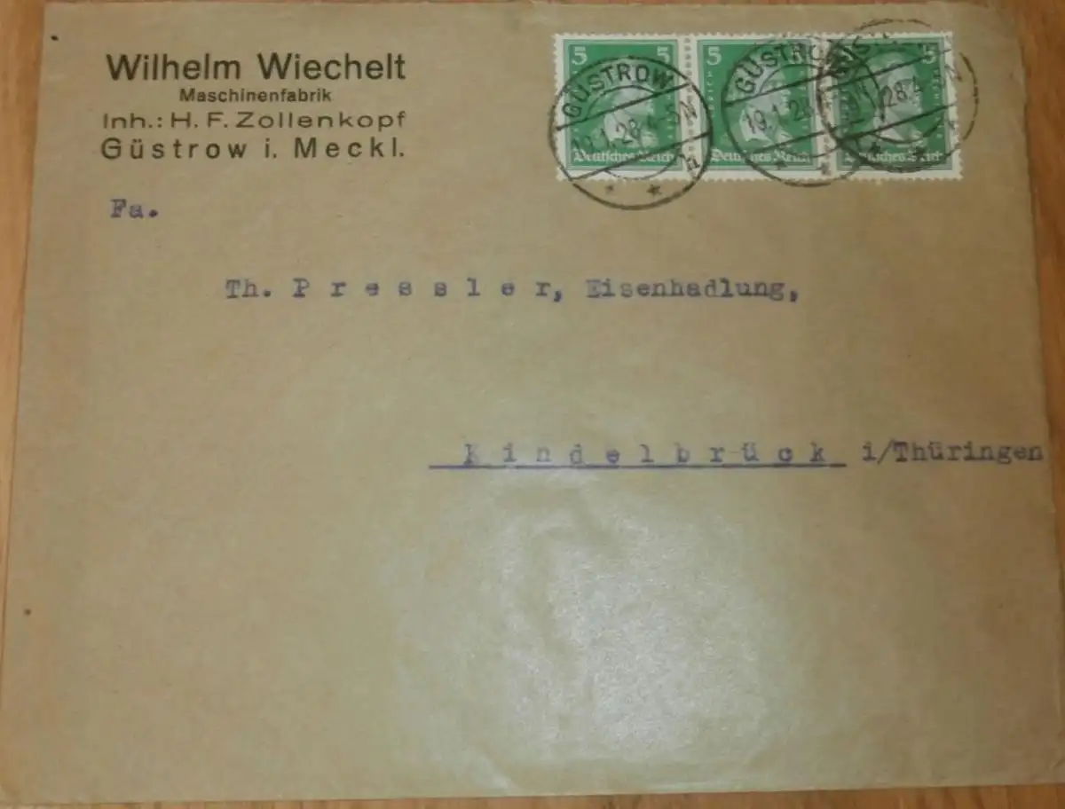 Maschinenfabrik - Wilhelm Wiechelt / H. Zollenkopf in Güstrow i.M., 1928 , alter Briefumschlag , Reklame , Mecklenburg !AZ-WR/1N