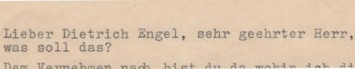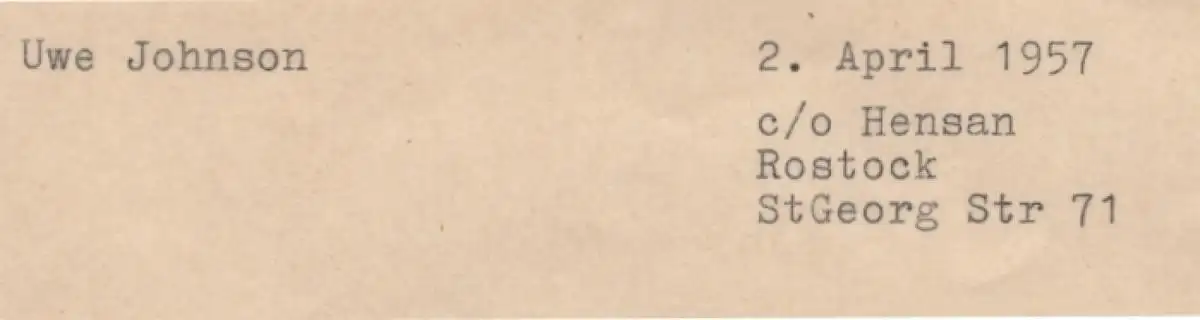 Bemerkungen: Zustand: Briefumschlag von Hand geöffnet, sonst, ebenso wie der Brief selbst, sehr gut erhalten // Der Brief (1 Seite) ist maschinengeschrieben (Vorderseite), ebenso der Umschlag, adressiert, frankiert und gestempelt (Güstrow vom 2.4. 1957). Der Brief schließt mit einer handschriftlichen kurzen Signatur Uwe Johnsons. Der Adressat Johnson verschickte den Brief unter dem c/o Hensan aus Rostock. Alice Hensan stellte eine Vertrauensadresse für Uwe Johnson dar und war eine Quartiergeberin und Freundin in Rostock (Quelle Jahrbücher der Uwe-Johnson-Gesellschaft). Der Inhalt des Briefes vom 2. April 1957 (also wohl vor seinen ersten Veröffentlichungen) offenbart hier schon die sprachlichen Feinheiten des deutschen Schriftstellers. Es ist eine witzige, ironische "Abrechnung" der Schulzeit mit dem Empfänger des Briefes Herrn Dietrich Engel, Lehrer an der Oberschule Jüterbog. Signiert