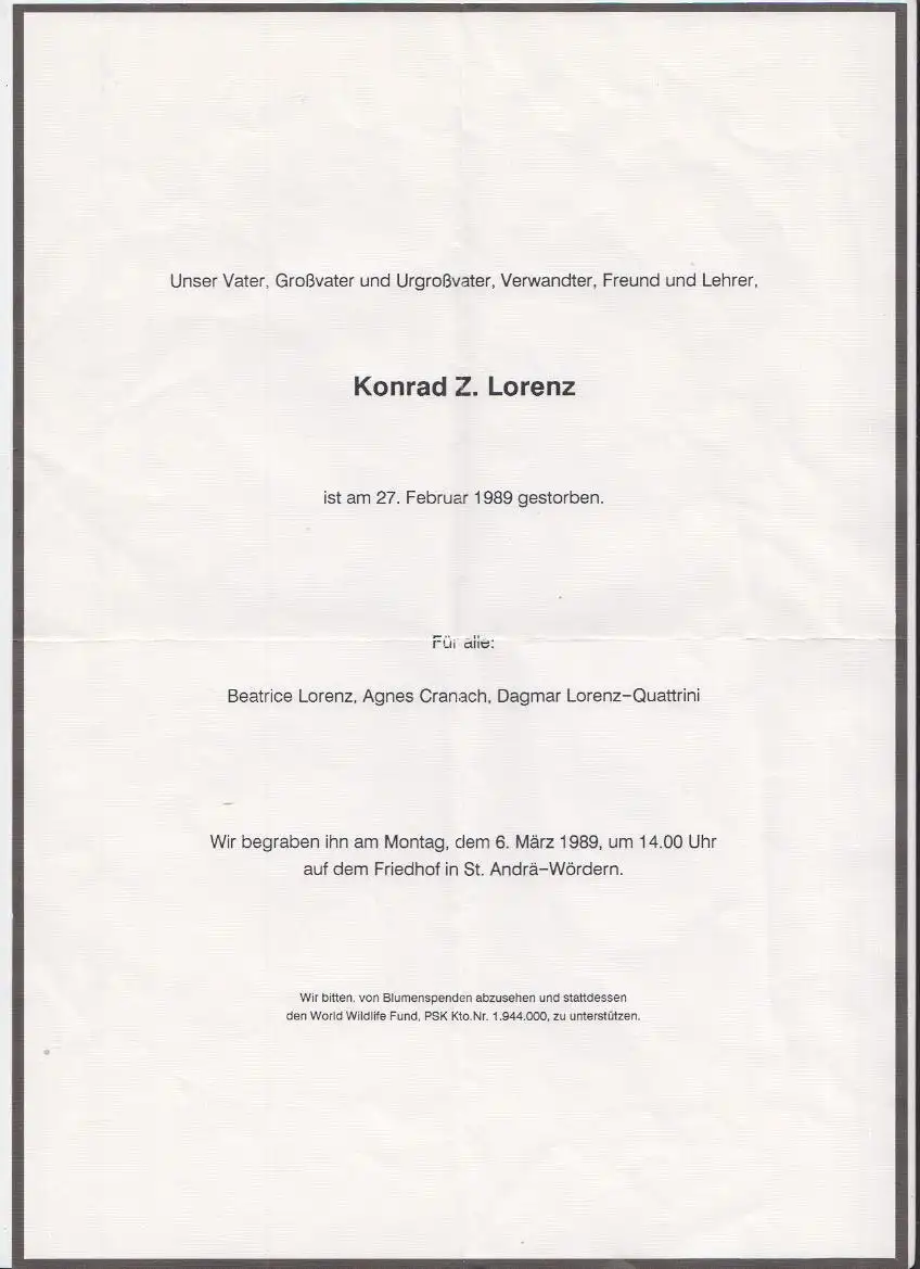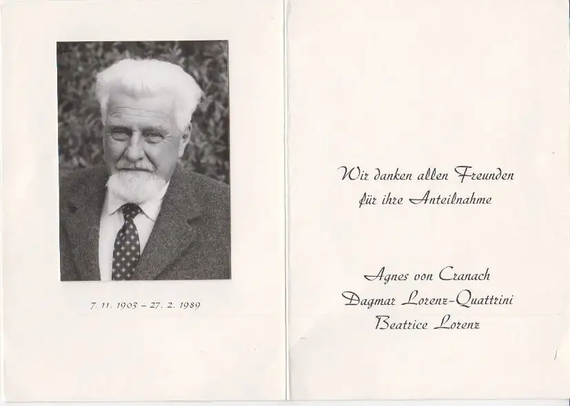 Bemerkungen: Dazu: Parte von Konrad Lorenz (7. 11. 1903 - 27. 2. 1989). - Dazu: Parte seiner Ehefrau Margarethe. Dazu: Dankschreiben für die Anteilnahme. Mit Photographie von Konrad Lorenz und hs. Zeilen v. Beatirice Lorenz. Dazu: Dankschreiben von Konrad Lorenz anläßlich seines 75. Geburtstag (1978). Gedruckte Karte m. hs. Zeilen u. eh. Signatur. Dazu: Brief an Konrad Lorenz. - Konrad Zacharias Lorenz (1903 - 1989 in Wien), österreichischer Zoologe, Medizin-Nobelpreisträger und einer der Hauptvertreter der klassischen vergleichenden Verhaltensforschung (Ethologie).