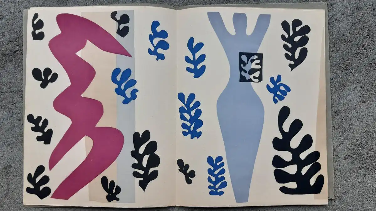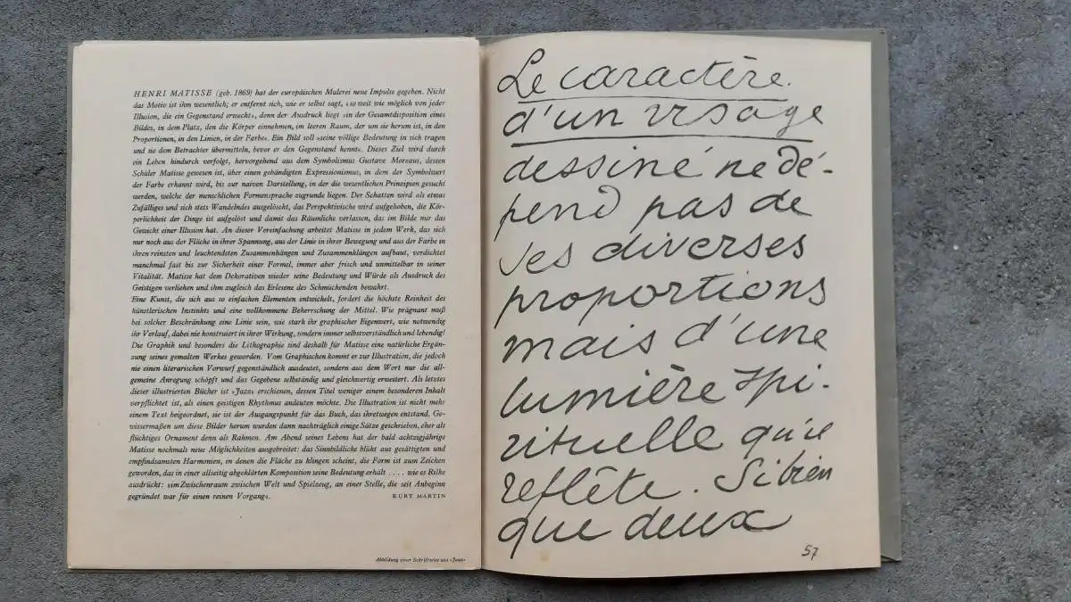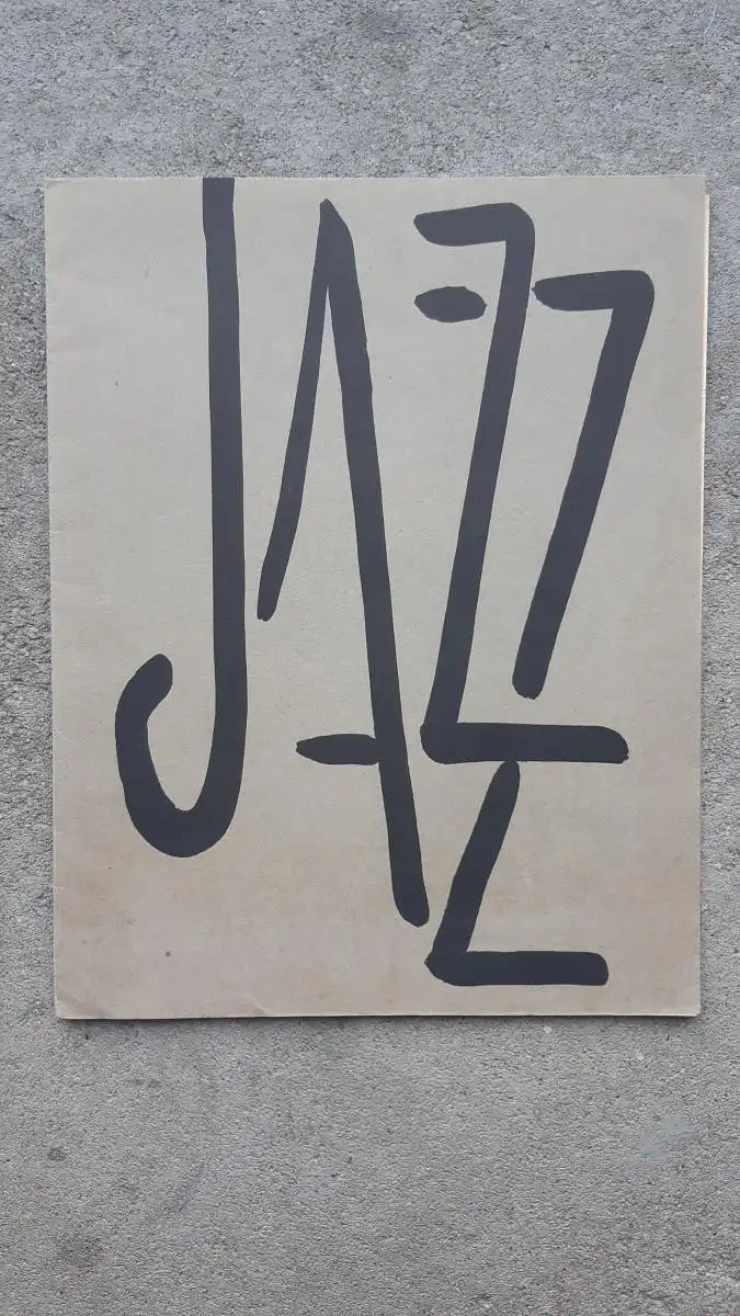 Prospekt auf Deutsch für das Künstlerbuch "Jazz" von Henri Matisse aus dem Jahr 1947. Erschienen im Verlag Gerd Hatje (1947), gedruckt bei der Union Druckerei GmbH, Stuttgart (Klischeewerk von Gustav Dreher, Stuttgart). Die Broschüre kündigt das 1947 in Paris vom Verleger Tériade für die Edition Verve herausgegebene Werk an, das als eines der wichtigsten und erfolgreichsten Künstlerbücher des 20. Jahrhunderts gilt. Prospekt mit 2 Textbögen und 2 doppelseitigen Farbtafeln L'enterrement de Pierrot und Le lanceur de couteaux, in Original Umschlag.
