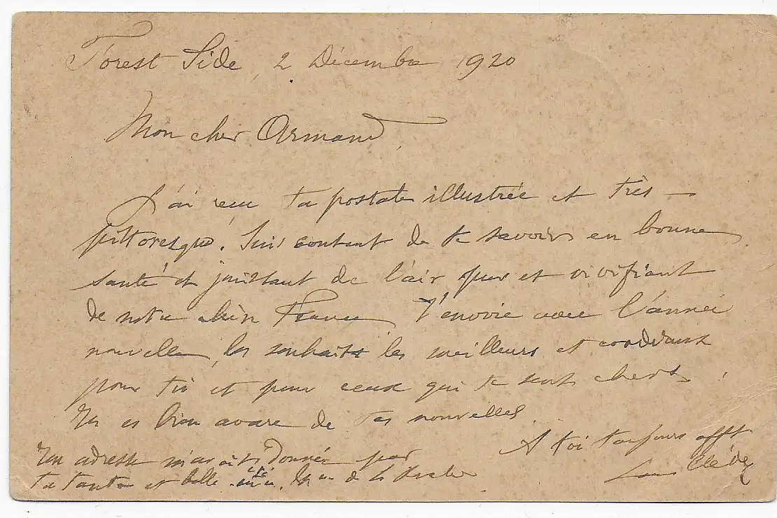 Mauritius: Post card Forest Side to Fontenay sous Bois, 1920