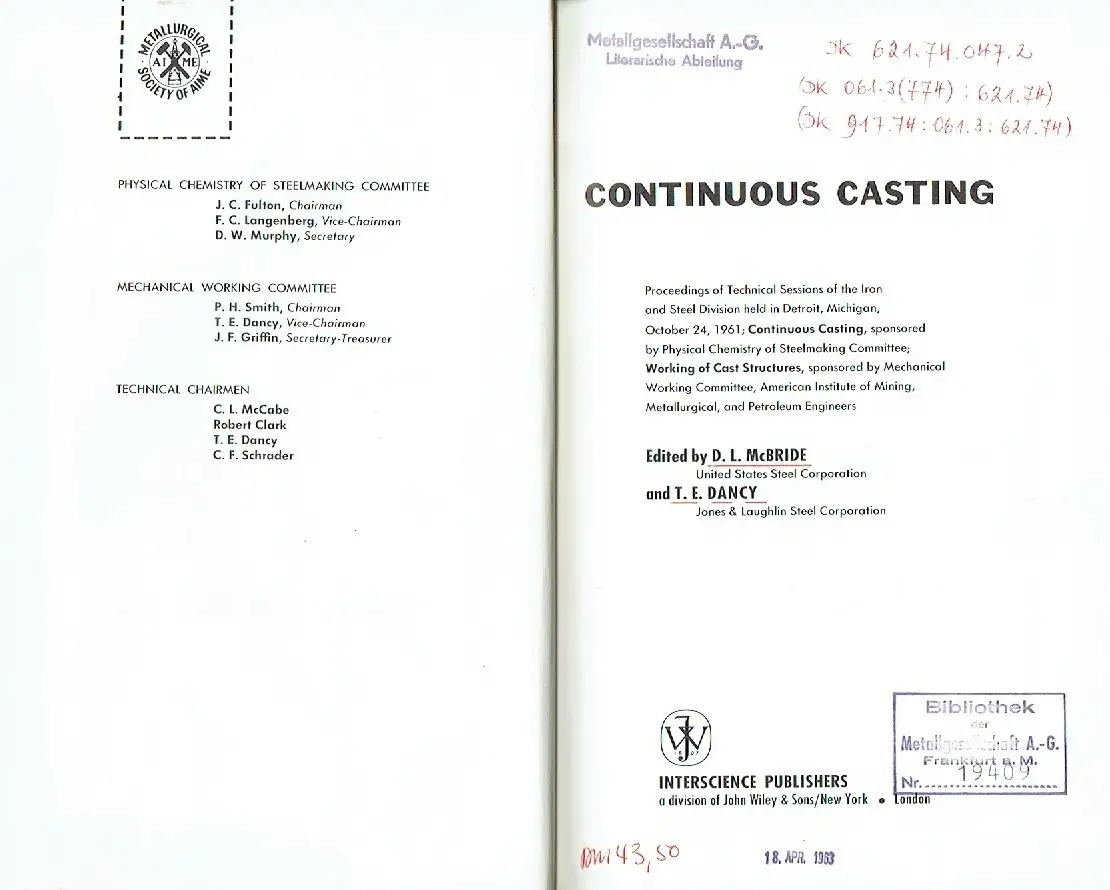McBride Iron and Steel Division Session Continuous Casting Proceedings Proceedings of Technical Sessions of the Iron and Steel Division, held in Detroit, Michigan, ... 1961.