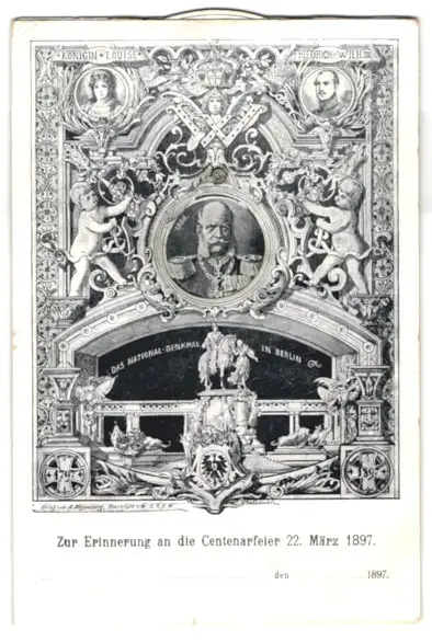 Mechanische-AK Berlin, Centenarfeier 1897, National-Denkmal, Portraits von Kaiser Wilhelm I., Friedrich-Wilhelm III.