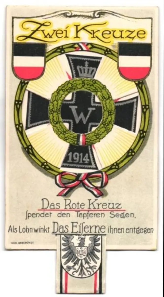 Mechanische-AK Eisernes Kreuz und Rotes Kreuz im Kranz mit Reichsfahne