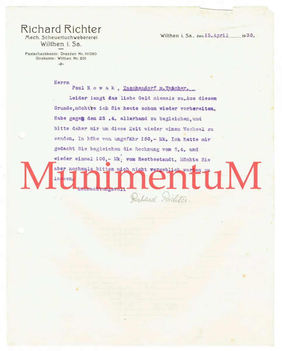Mechanische Scheuertuchweberei Richard Richter WILTHEN | Rechnung Mahnung 1930