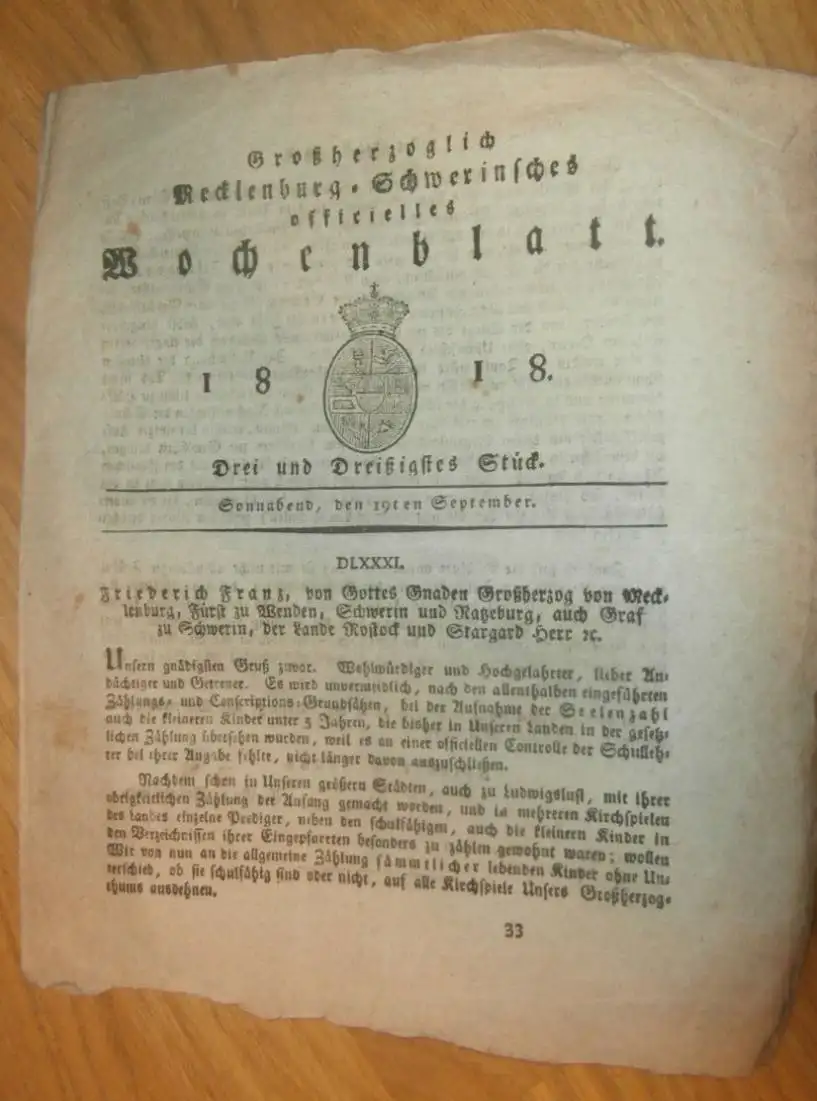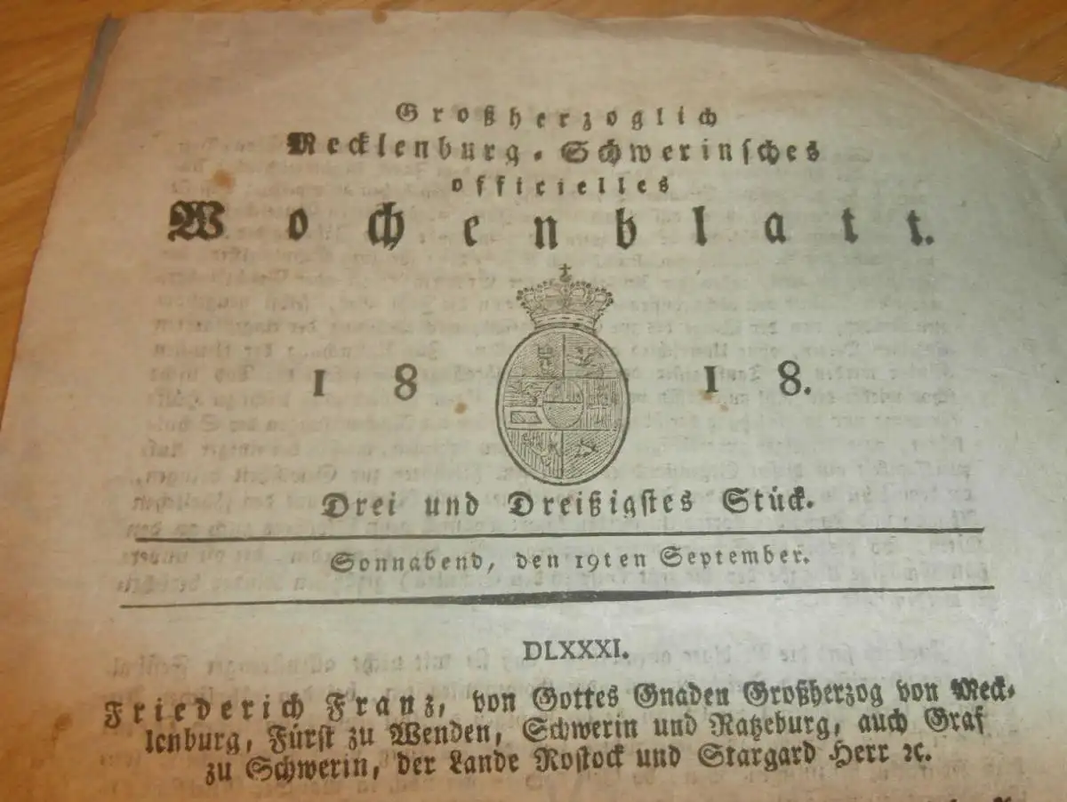 Großherzogliches Mecklenburg-Schwerinsches Wochenblatt 1818:Hier einige Stichworte um die es geht: Mecklenburg - Schwerin 19.09.1818 , Seelenzahl in Städten , Kaiserlich Russische Truppen , Mark in Lübz !!AZB-1/WR2