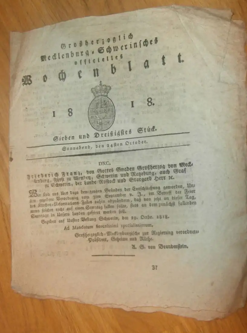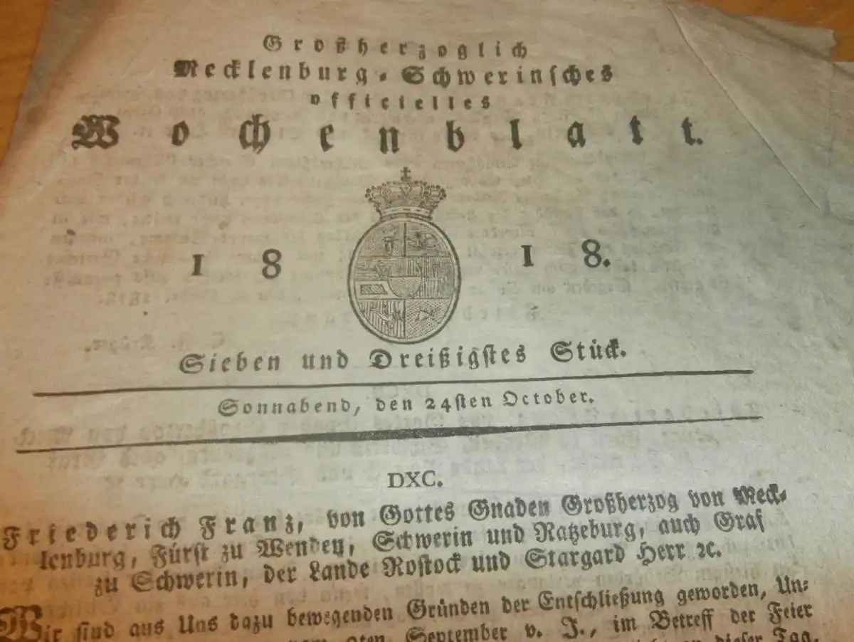 Großherzogliches Mecklenburg-Schwerinsches Wochenblatt 1818:Hier einige Stichworte um die es geht: Mecklenburg - Schwerin 24.10.1818 , Flößung auf der Elde , Markt in Krakow / Crackow , Schlackendorf b. JördensdorfAZB-1/WR2