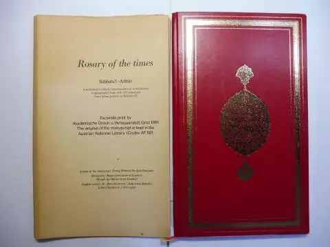 Erstauflage der Ausgabe (1000 Expl.) / 2 Textehefte in Englisch/Türkisch (Haberler Tesbihi). English version: Dr. Hans Suesserott - Julia Anita Babeluk. Schöne Florale Vorsätze / Hintersätze - Bll. + 33 S. mit ganzseit. farb. Abbildungen (Text, Portraits d. Sultane...) u. Golddruck. 4° (30 x 18, 5 cm), O(Rot)-GanzLeder mit goldgepr.-Illustr.-u. Leisten sowie Or.-Schutzumschlag (Umschlag mit wenig. Läsuren die hinterlegt wurden). Gut bis sehr gut erhalten. Tip !