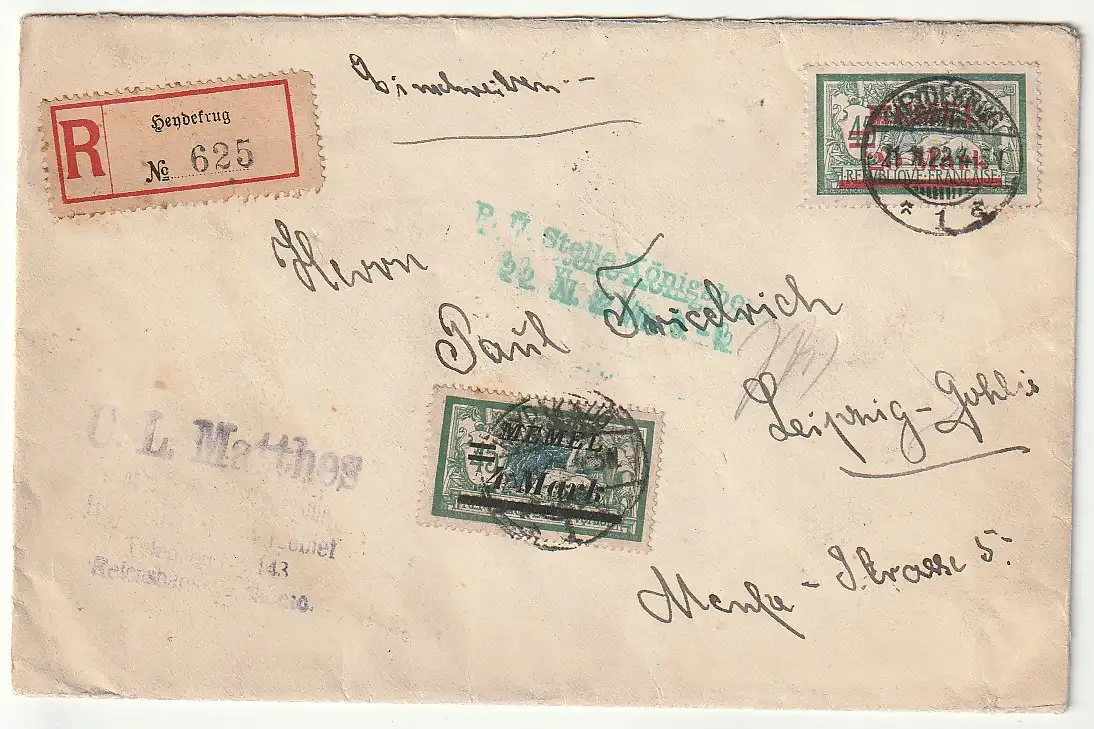 Memel: Einschreibbrief nach Leipzig, Befund Haslau BPP
