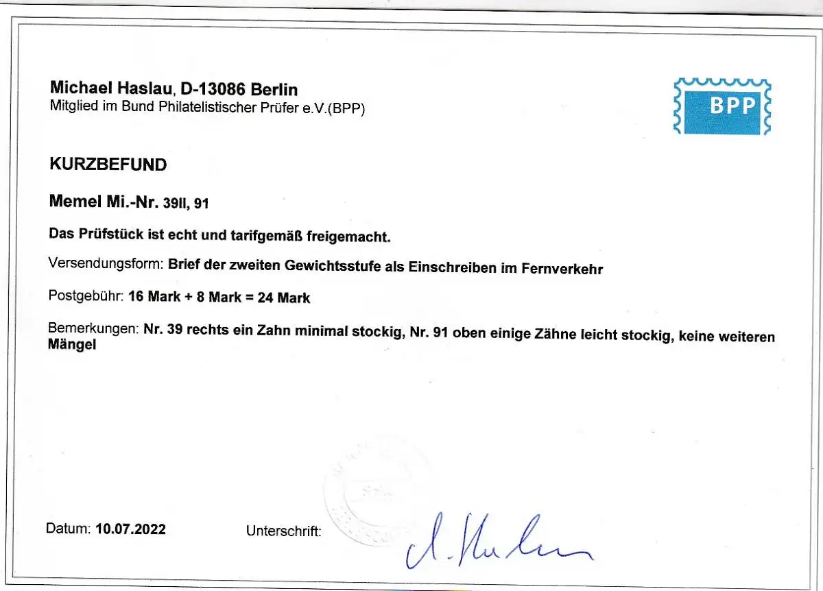 S. Abbildung und KBefund Haslau BPP. Frankatur: 39II, 91. Michelwert 125,00 €