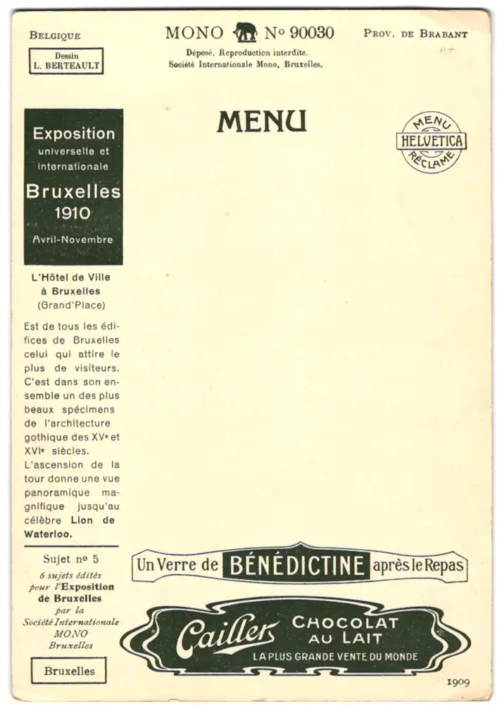 Menükarte Brüssel 1910, L`Hotel de Ville a Bruxelles, Blanko