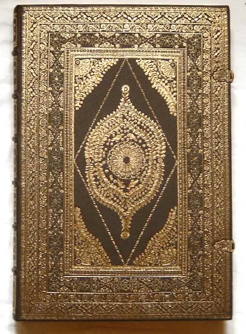 mit zahlreichen colorierten Textabbildungen nach Kupfern von Matthäus Merian. (Kupferstiche in 7-Farbendruck - Titelblatt mit 23 1/2 Karat handvergoldet) (dunkelblaues) ill. OLdr. (auf 6 Bünden) mit sehr reicher Goldprägung und 2 Messing-Schließen und punziertem Ganzgoldschnitt, farbig illustr. Titelblatt, 28 Bll., 129 num. Bll., 3 Bll., 2° (= 44 x 31,5 cm)