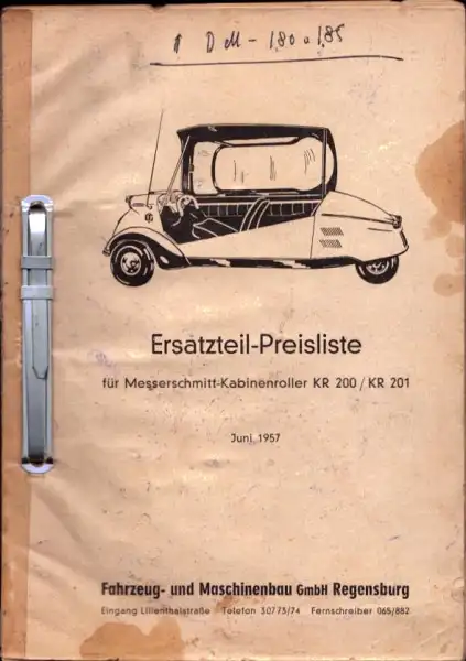 Messerschmitt KR 200 / 201 Ersatzteil-Preisliste 6.1957