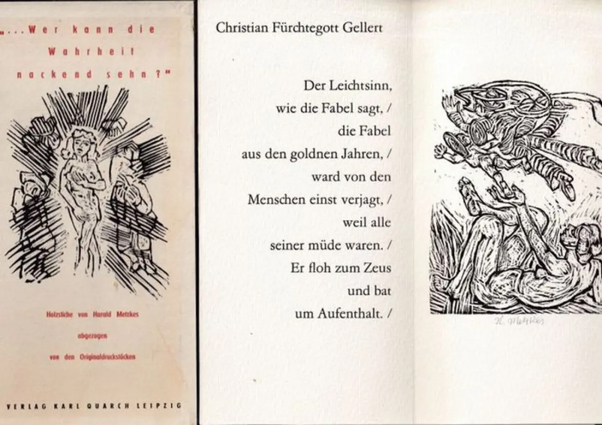 Metzkes, Harald (Illustr.): Christian Fürchtegott Gellert, Iwan Krylow, Magnus G. Lichtwer, Daniel Schiebeler, Gotthold Ephraim Lessing: Wer kann die Wahrheit nackend sehn? - Holzstiche von Harald Metzkes abgezogen von den Originaldruckstöcken (mit folgen