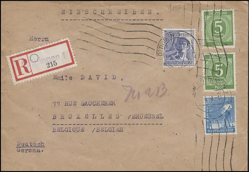 MiF Kontrollrat I+II auf R-Brief Not-R-Zettel GÖTTINGEN Juni 1948 nach Brüssel
