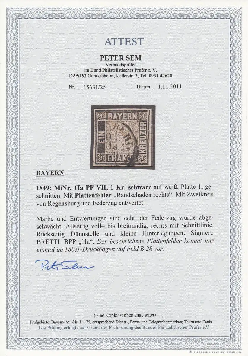 MiNr. 1 I a Platte 1, PF VII, gestempelt Regensburg, BPP Attest