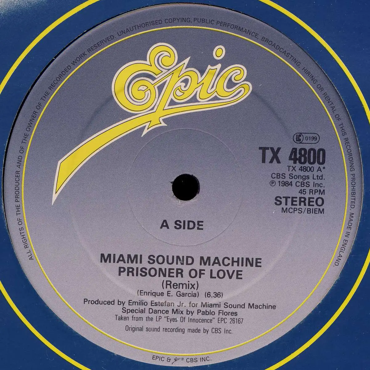 12" Maxi Miami Sound Machine - Prisoner Of Love, Einheitscover der Plattenfirma, Zustand Platte VG+ Hülle VG+; Made in United Kingdom 1984 Epic TX 4800, Tracks RMX 6:36, Instr. 4:45, Toda Tuya Todo Dia Eva Dia De Indio 4:39