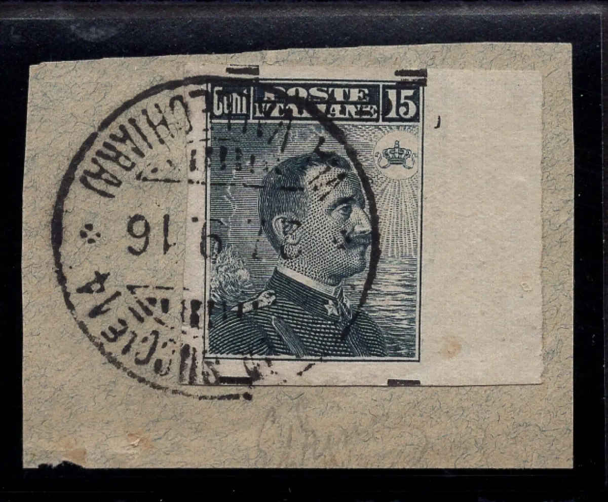Fragment - Michetti Cent. 20 auf 15 n. 106ma ungezähnter Bogenrand mit stark nach oben verschobenem Aufdruck (zu Pferd) - gebraucht, perfekt auf Umschlagfragment mit kompletter Annullierung - schön und ungewöhnlich Cod. 3332/WEB