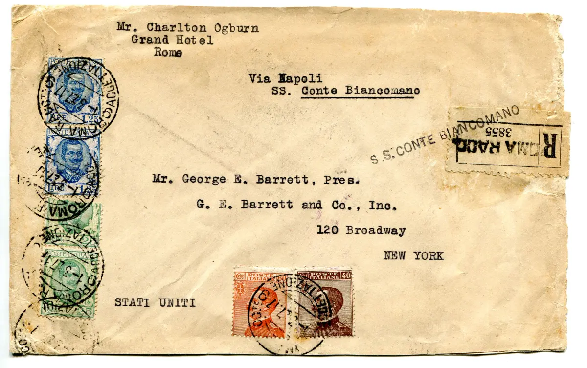 - Michetti Cent. 60 Nr. 205 + Ergänzungen Nr. 84 + 200 x 2 (eine aufgesetzte gerissen) + Nr. 202 Paar auf Umschlag Racc. für New York am 1.3.27 - seitlich geschrieben vom Absender Via Napoli SS. Graf Biancomano auf der Rückseite Ann. Torino Ferr. America n. 112/A