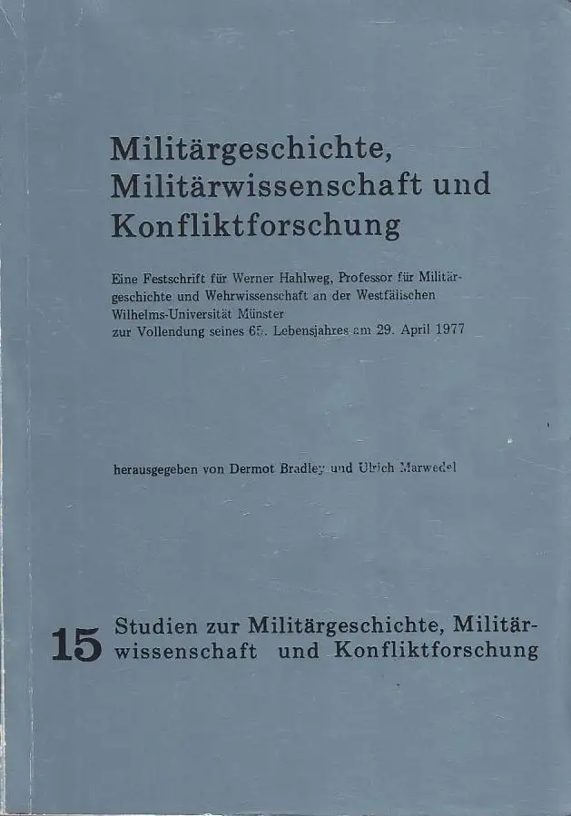 Titel: Militärgeschichte, Militärwissenschaft und Konfliktforschung. Festschrift für Werner Hahlweg, Prof f. Miitärgeschichte u. Wehrwiss. an der Westf. Wilhelms-Universität Münster z. Vollendung seines 65. Lebensj. am 29. April 1977 (= Studien zur Militärgeschichte, Militärwissenschaft und Konfliktforschung, 15)