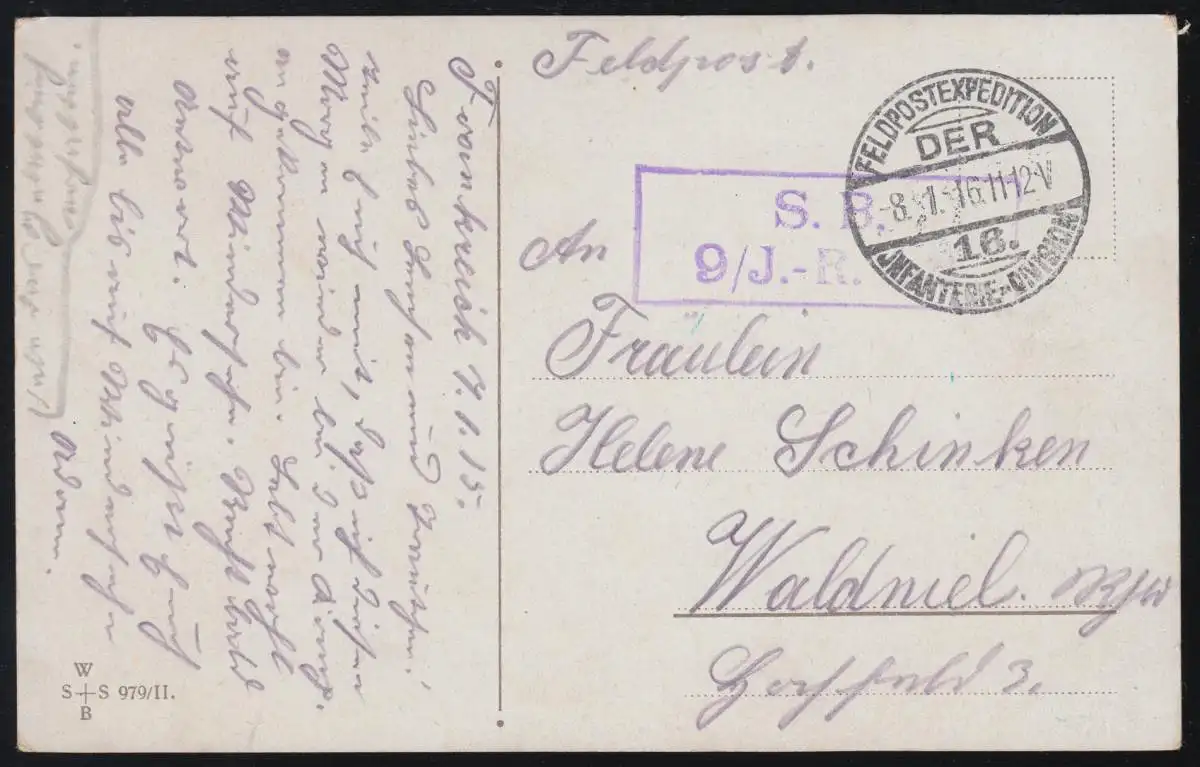 mit Briefstempel S.B. 9/J.-R. aus Frankreich nach Waldniel / Rheinland