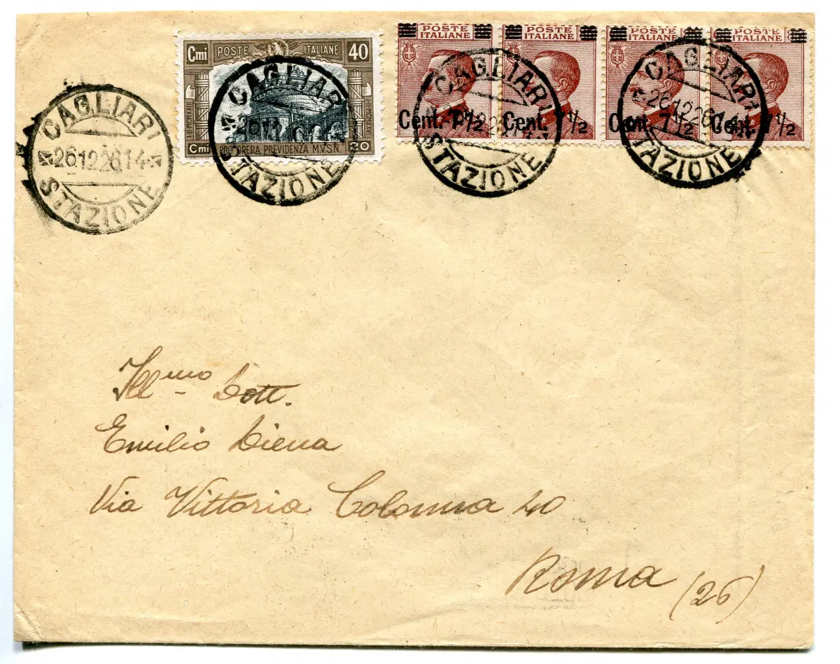 - Miliz I Cent. 40 Nr. 206 + ergänzender Viererstreifen der Nr. 135 ein Exemplar mit abgerundeter Ecke) auf Umschlag von Cagliari nach Rom am 26.12.26 - Ungewöhnliche Nr. 114/A