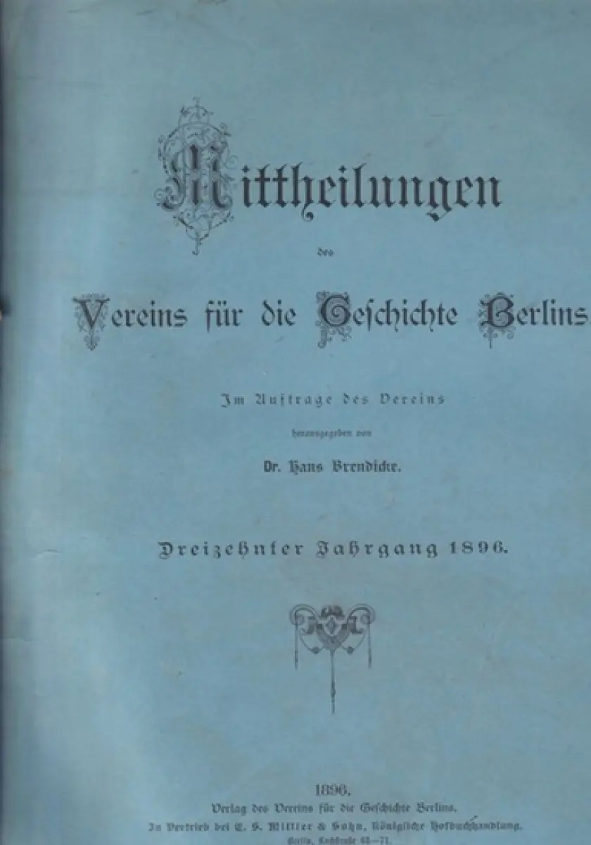 Verlag des Vereins für die Geschichte Berlins, Berlin. Vertrieb E.S. Mittler & Sohn 1896