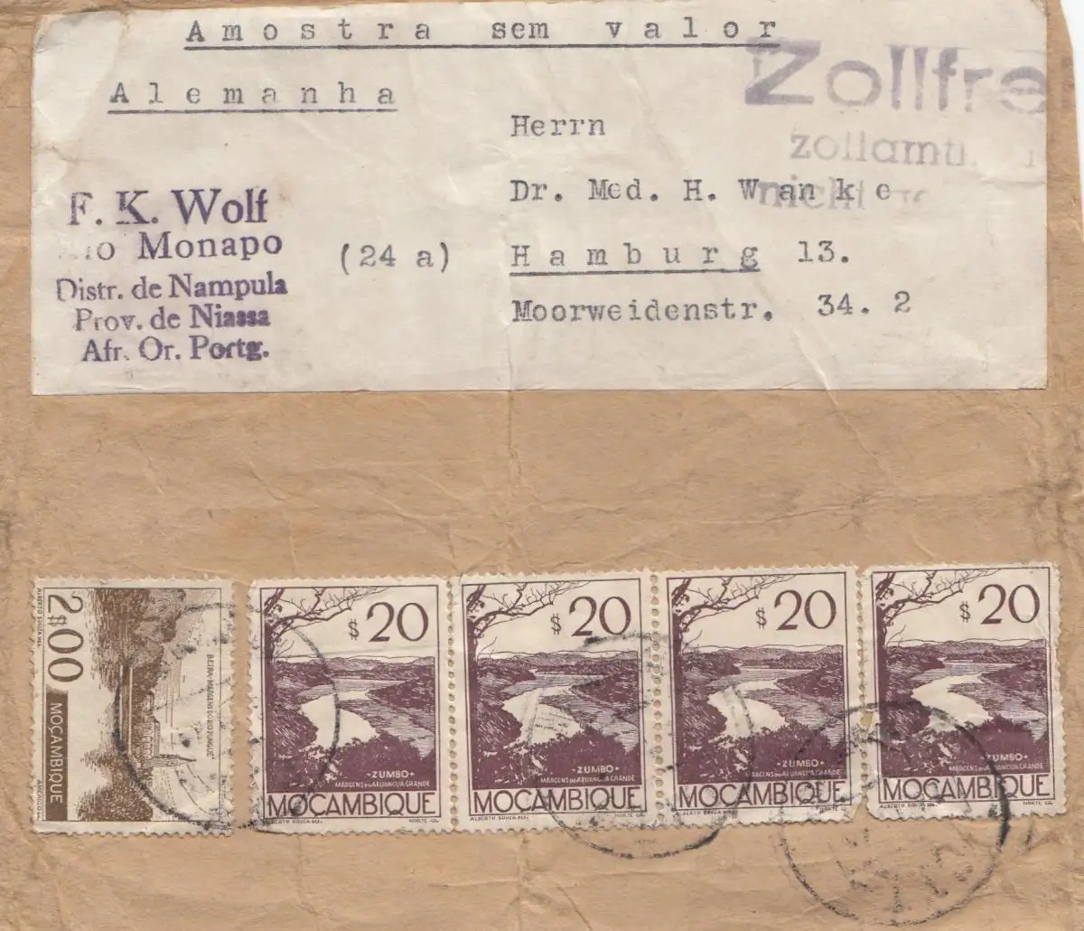 Mocambique Monapo/Niassa - Sample no value to Hamburg, front page, Zollfrei