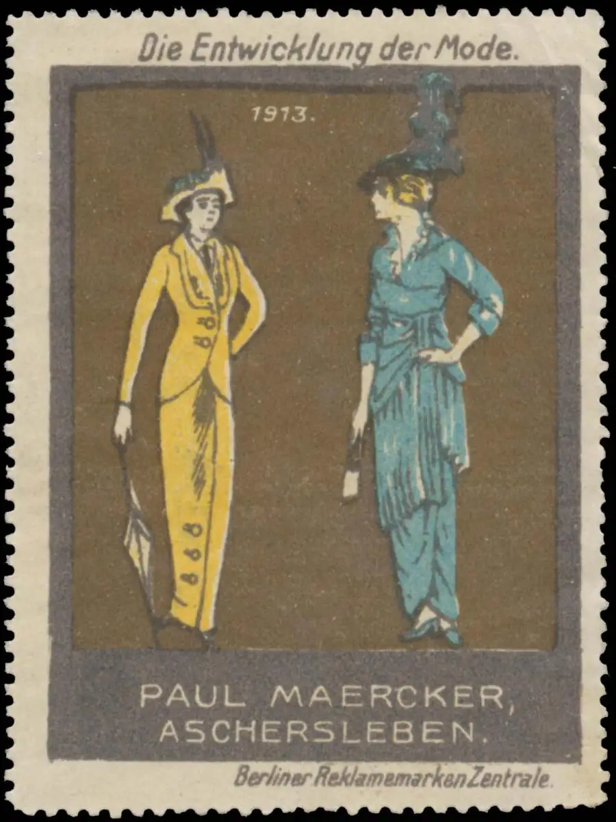 Die Entwicklung der Mode, Druck: Berliner Reklamemarkenzentrale, Berlin, Größe/Zustand: 6x5 , leicht beschädigt, Original alte Reklamemarke die seinerzeit für die Werbung benutzt wurde