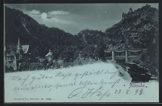 Mondschein-AK Altenahr, Teilansicht mit Brücke und Burg