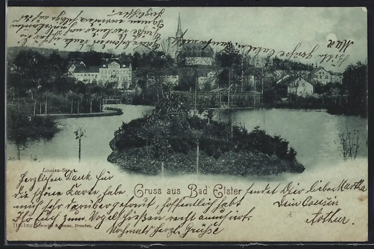 Mondschein-AK Bad Elster, Louisa-See mit Stadtpanorama im Hintergrund