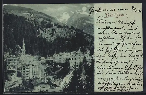 Mondschein-AK Bad Gastein, Ortsansicht mit Bergblick aus der Vogelschau