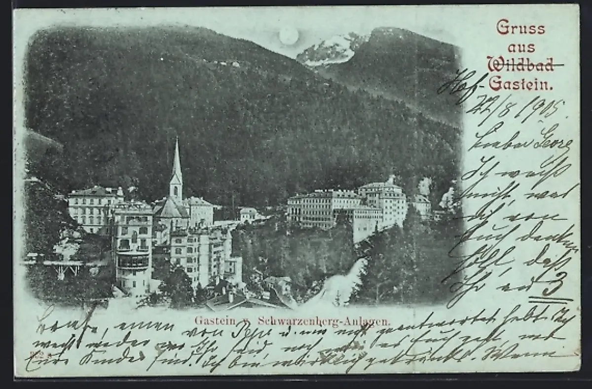 Mondschein-AK Bad Gastein, v. Schwarzenberg-Anlagen aus der Vogelschau