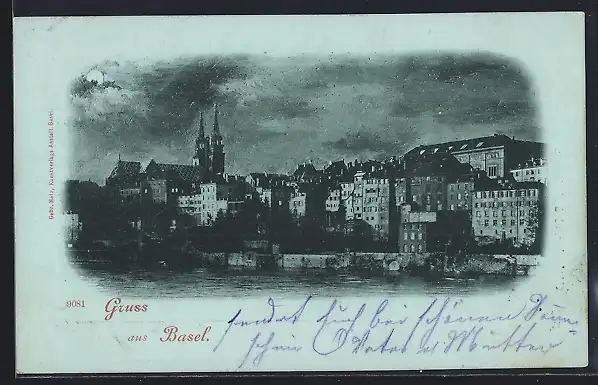 Mondschein-AK Basel, Uferpartie mit Kirche