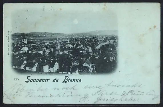 Mondschein-AK Bienne, Panorama mit Kirche