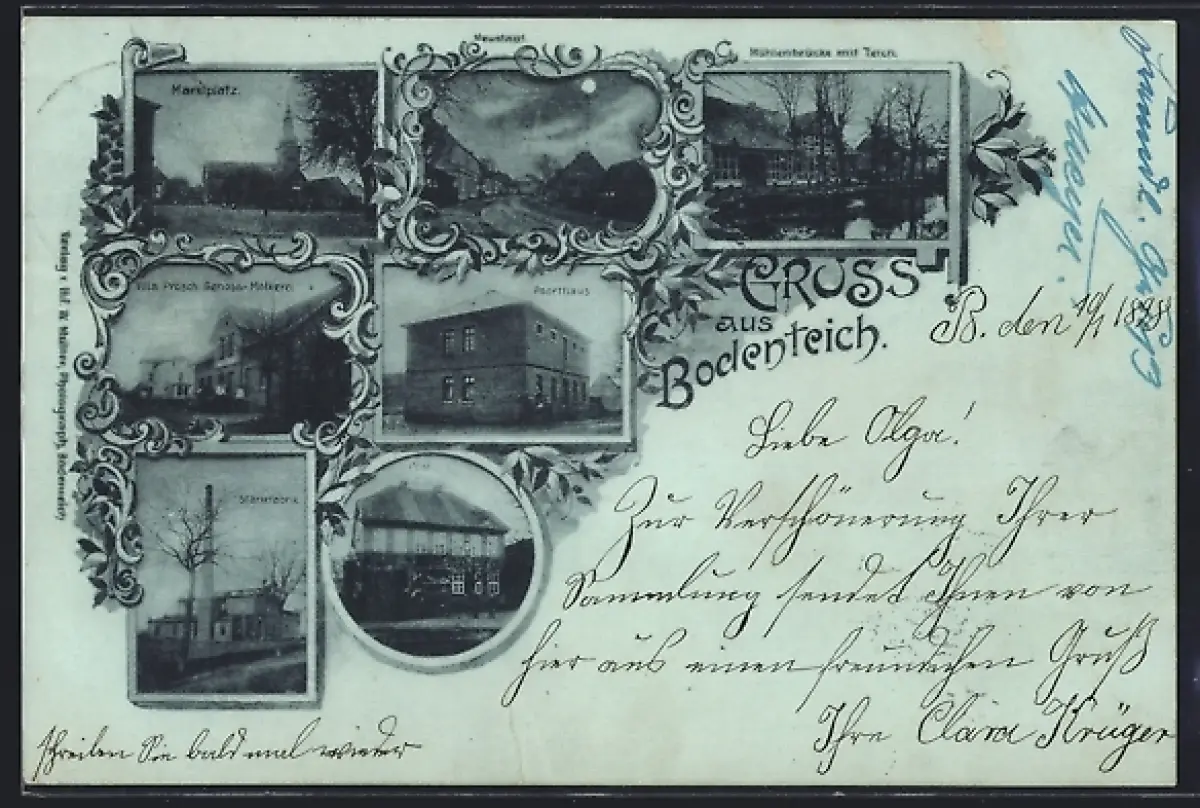 Mondschein-AK Bodenteich, Post, Poorthaus, Marktplatz, Villa Prösch, Genoss.-Molkerei