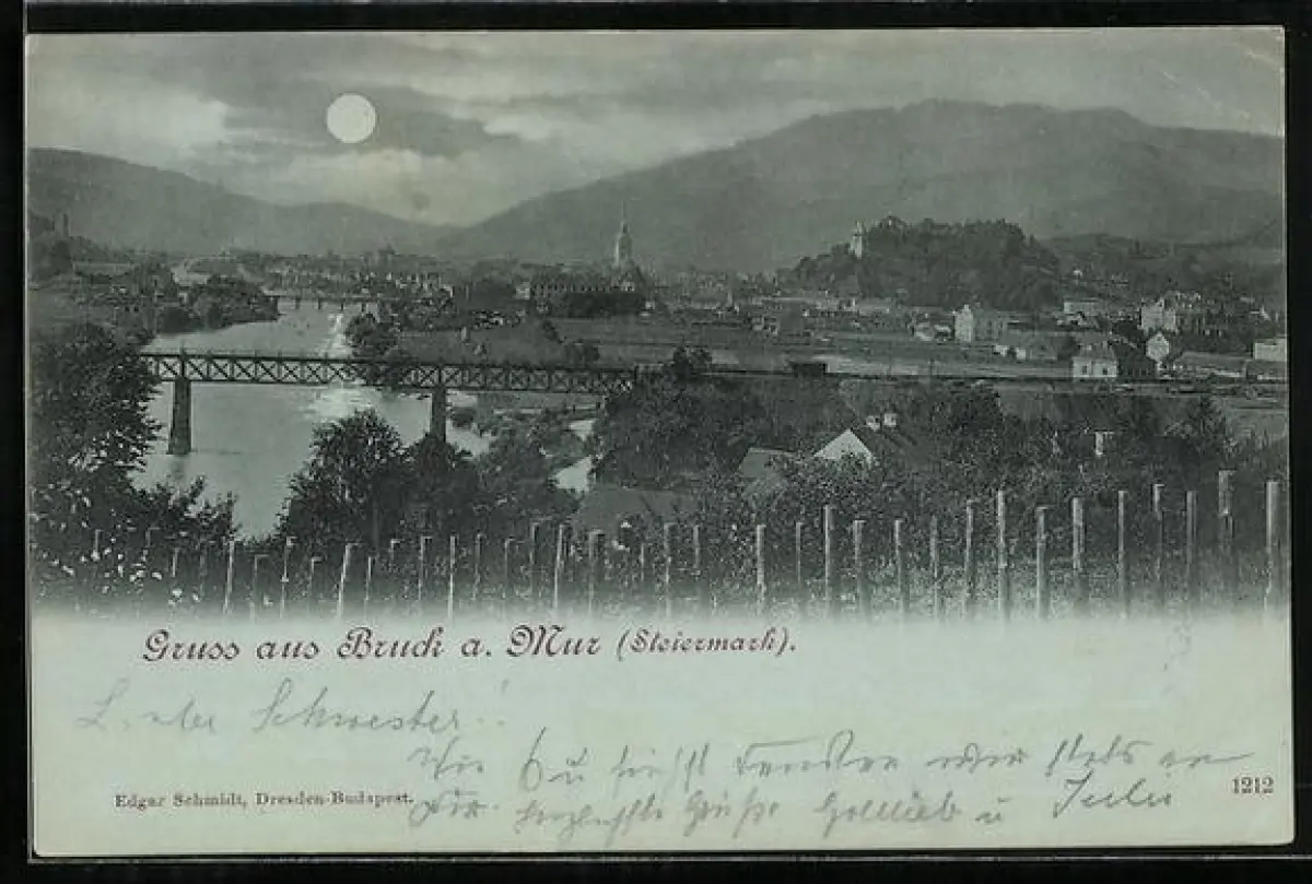 Mondschein-AK Bruck a. Mur, Teilansicht mit Flusspartie und Brücken