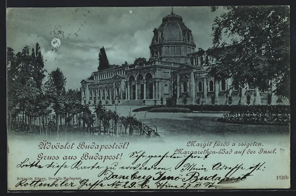 Mondschein-AK Budapest, Margarethen-Bad auf der Insel