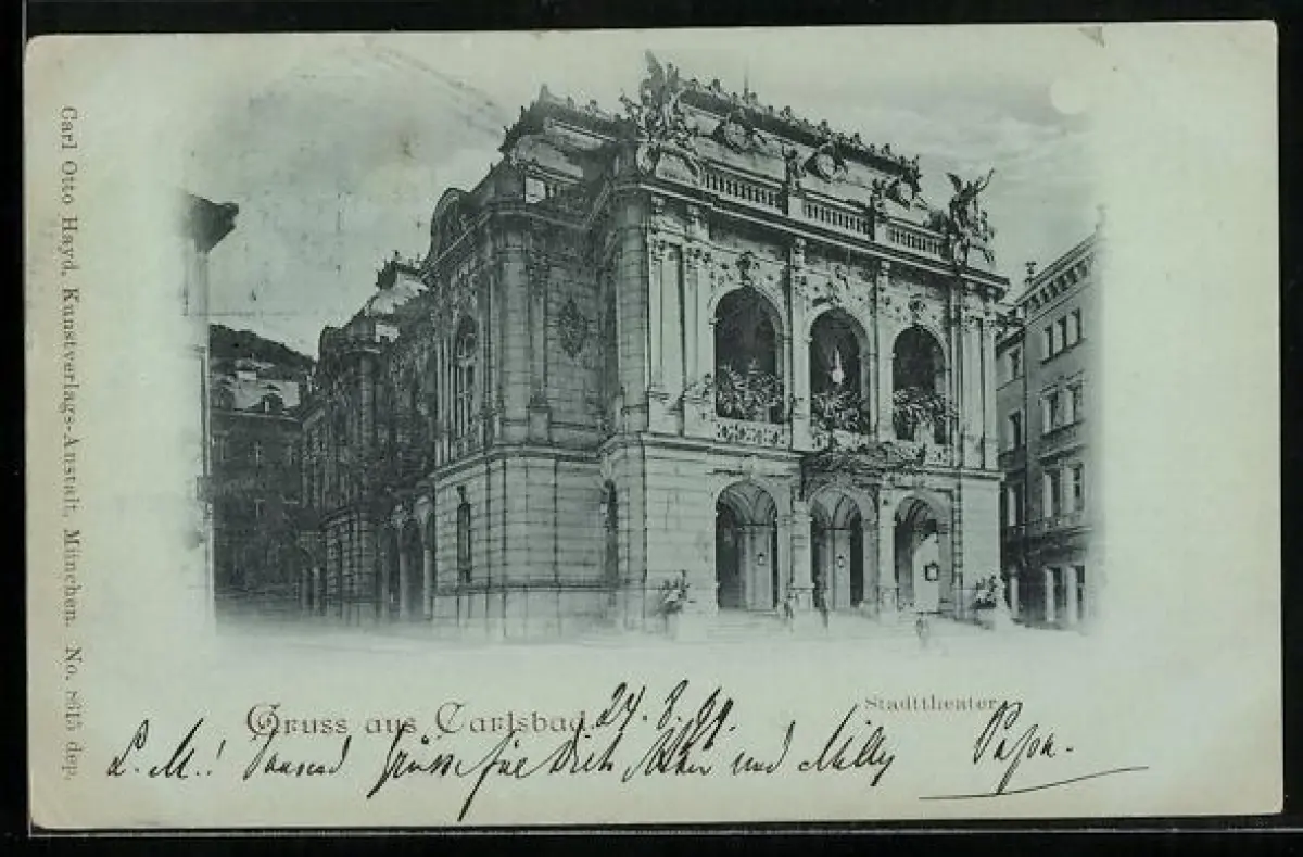 Mondschein-AK Carlsbad, Stadttheater, Totalansicht