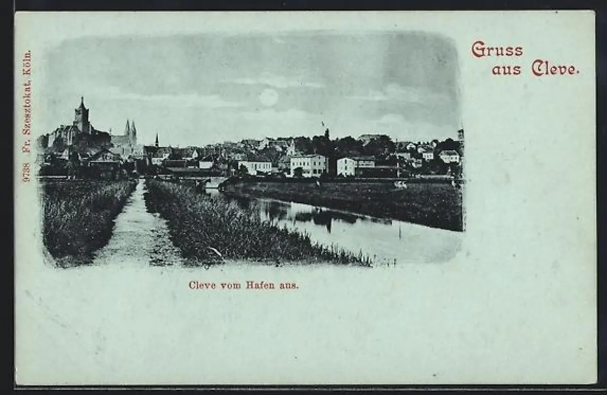 Mondschein-AK Cleve, Blick vom Hafen auf Stadt und Kirche