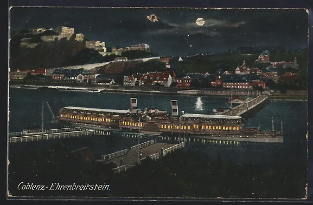 Mondschein-AK Coblenz-Ehrenbreitstein, Rheinpartie mit Festung und Schiffsanleger bei Nacht
