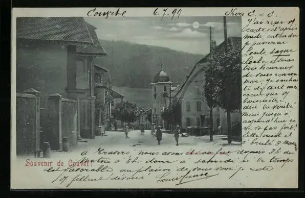 Mondschein-AK Couvet, Strassenpartie mit Kirche