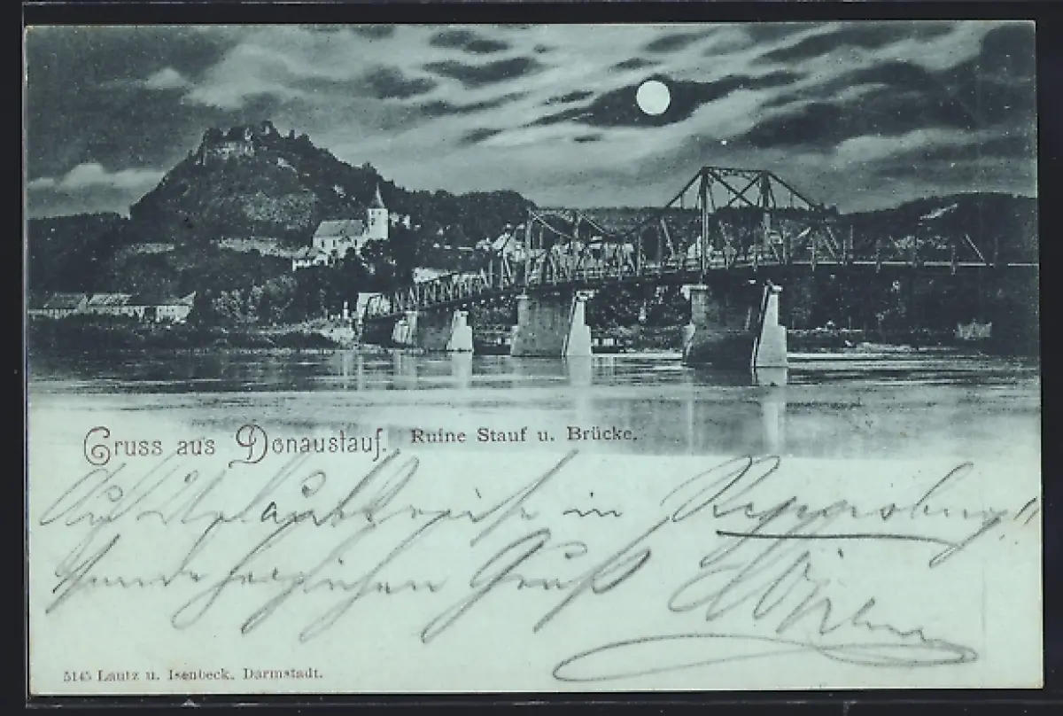Mondschein-AK Donaustauf, Ruine Stauf und Brücke