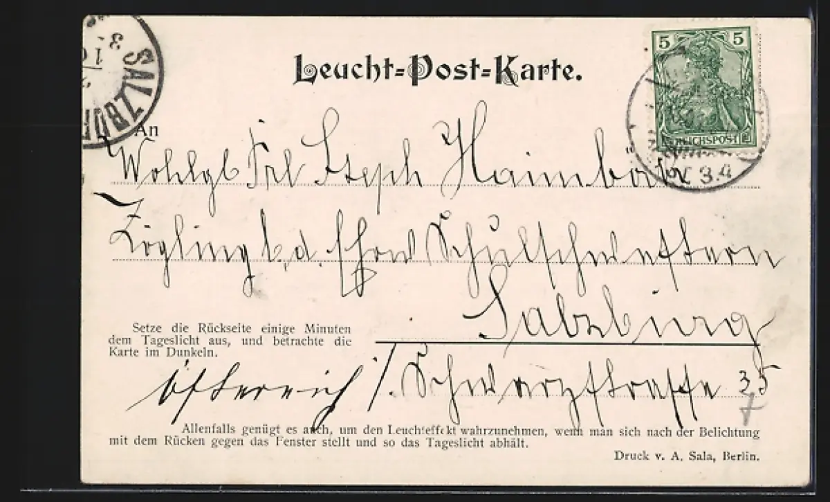 Personenbezogene Daten auf der Rückseite der Karte wurden durch blauen Textmarker unkenntlich gemacht. Die blauen Stellen sind auf die Vorderseite durchgeweicht und wirken sich negativ auf das Postkartenfoto aus